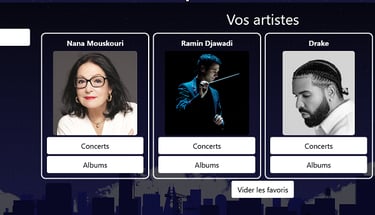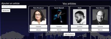 The school project entails creating a music content management system using Angular framework, integrating the BandsInTown API for concert data, the YouTube Player API for video playback, and the Spotify API for artist, album, and song information. Users can search and favorite artists, explore albums and songs, discover concerts with Google Maps integration, and watch YouTube videos based on selected songs. The application supports both English and French languages, with persistent storage for favorite artists.
