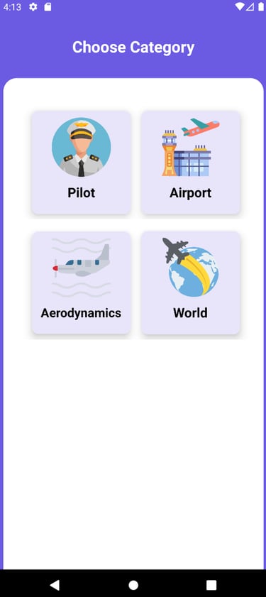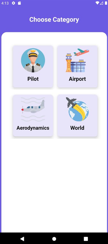 Mobile application developed using Android Studio: A quiz game focused on aviation trivia. The app provides a user-friendly interface for aviation enthusiasts to test their knowledge and enjoy an entertaining quiz experience. With a variety of questions covering different aspects of aviation, the game offers accessibility and engagement for users of all levels.